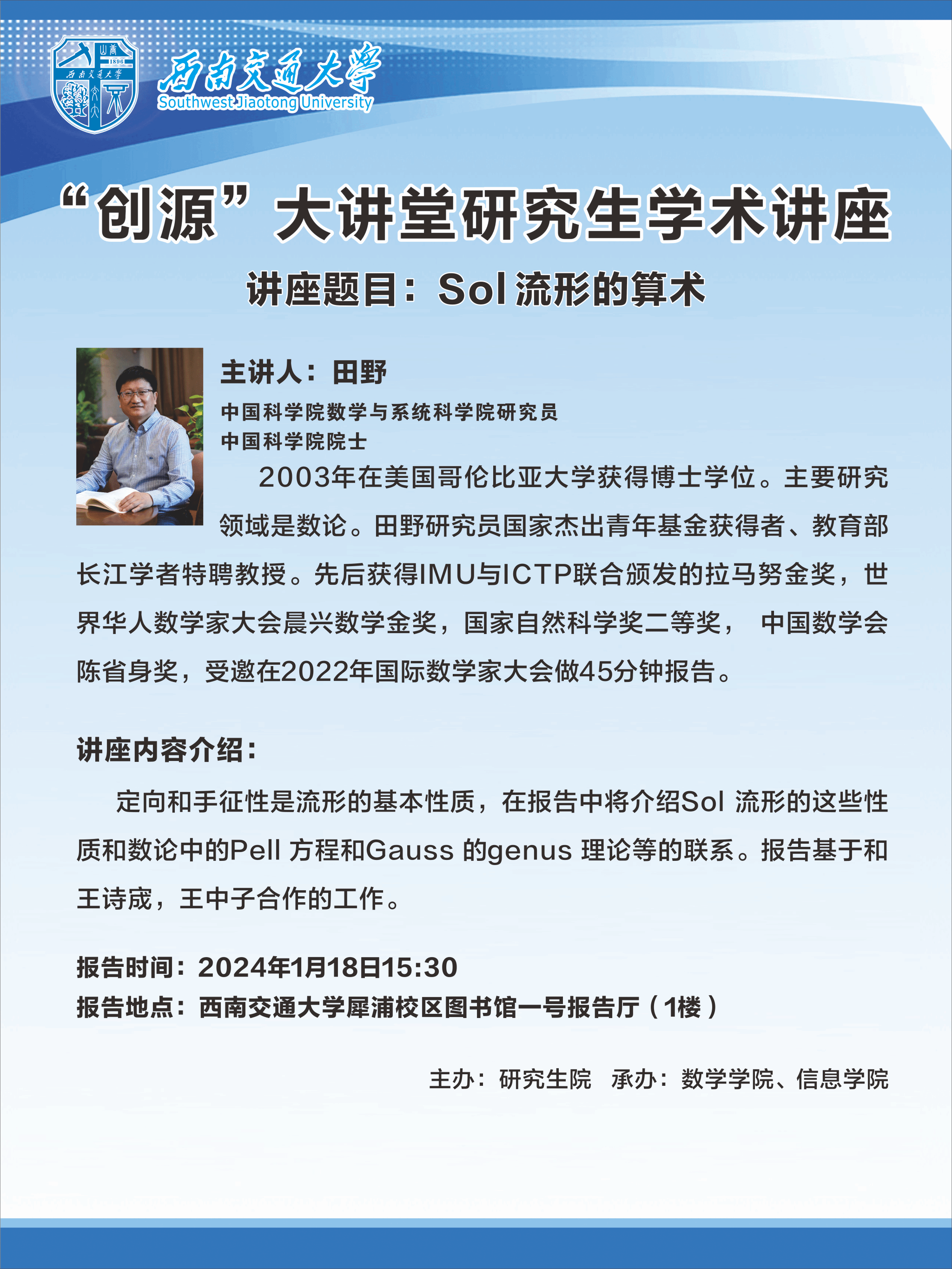 讲座人介绍:田野,中国科学院数学与系统科学院研究员,中国科学院院士。2003年在美国哥伦比亚大学获得博士学位。主要研究领域是数论。田野研究员国家杰出青年科学基金获得者,教育部长江学者特聘教授。先后获得IMU与ICTP联合颁发的拉马努金奖,世界华人数学家大会晨兴数学金奖,国家自然科学奖二等奖, 中国数学会陈省身奖,受邀在2022年国际数学家大会做45分钟报告。