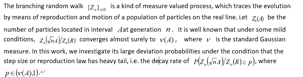 个人简介:张树雄, 概率论专业博士生。2016.09-2021.07年在北京师范大学学习(硕博连读),师从何辉教授。研究方向为分枝随机游动的大偏差理论,布朗运动,超过程等。
