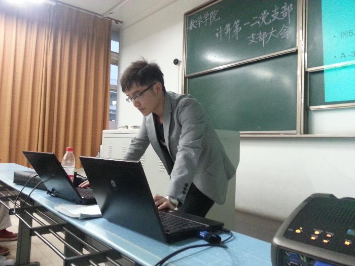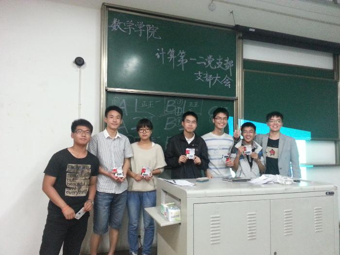 计算第一二党支部的第一次支部大会。与会成员有:计算第一党支部书记何耀旭同志,支部组织委员马宇同学,宣传委员魏栋同学以及其他党员,预备党员与所有入党积极分子。本次会议由支部书记何耀旭主持。