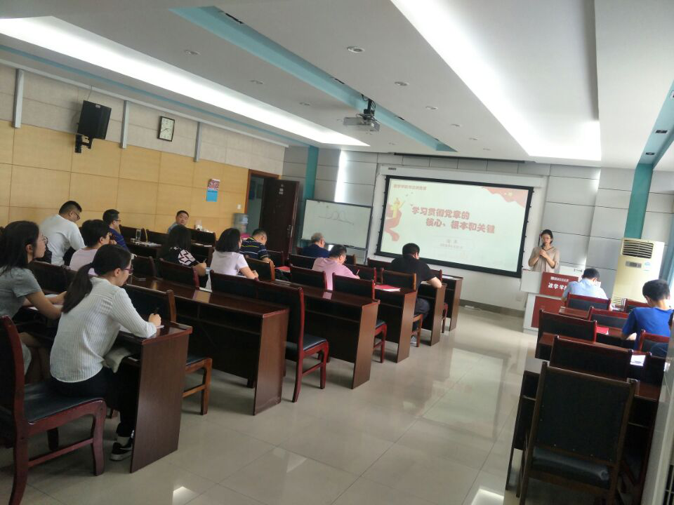 徐革书记讲解新党章学习专题,她从学习贯彻党章的核心、根本和关键几个方面说起,她提到学习贯彻党章的核心是以习近平新时代中国特色社会主义思想为行动指南,学习贯彻党章的根本就是不忘初心、牢记使命、永远奋斗,她强调学生党支部要牢记两大历史任务,高举伟大旗帜、明确历史方位、坚决维护核心,牢记四个意识,结合实际工作学习党政、观测党章,建设优秀党支部。