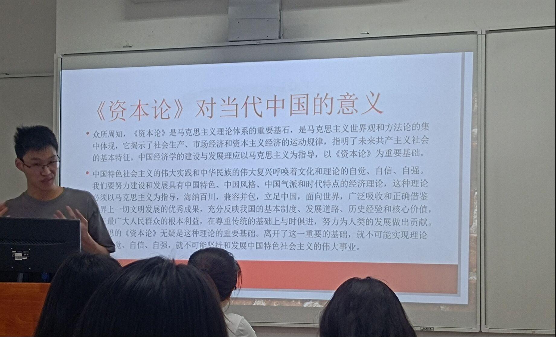 毛智彬同学表示:“资本论所得出的结论具有现实的可预见性和历史前瞻性,论证了资本主义社会逐渐走向灭亡的历史趋势,所以我们要坚定不移地走中国特色社会主义道路。”任敏同学赞同地说道:“我们分析学习《资本论》,一定要结合时代特征,批判性地学习。”