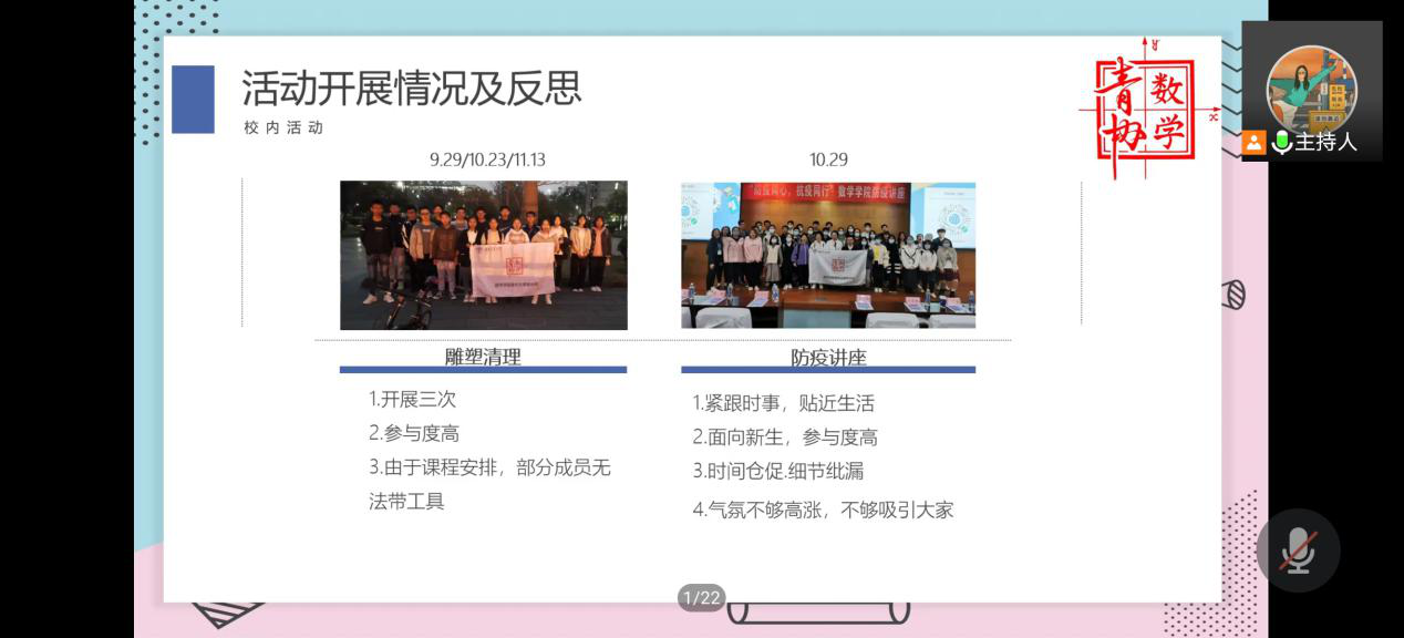 由于疫情防控需要,本次总结大会于线上通过腾讯会议开展。大会首先由主持人杨茗茜和余昊屹介绍到场嘉宾,然后由数学青协指导老师王亚梅老师致辞。王亚梅老师强调了“保持初心”对每一位青协成员的重要性,并提出要学会反思总结,鼓励成员继续奋斗、不断提升工作态度与工作方法。