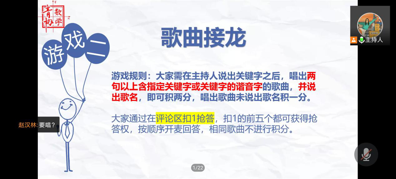 接下来又到了游戏环节——歌曲接龙:要根据主持人给出的关键字唱出包含关键字的歌曲,关键字为“立”“足”“当”“下”“心”“向”“远”“方”。这个游戏不仅展现了成员们的音乐才能,更饱含了对部员们的美好祝愿。