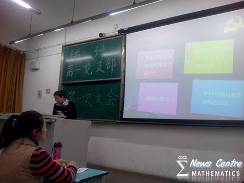 统计本科生第一党支部第一次大会正式开始,指导老师为团委副书记兼11级辅导员张娟老师,参加会议的是第一党支部的党员和入党积极分子。