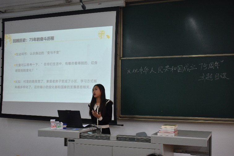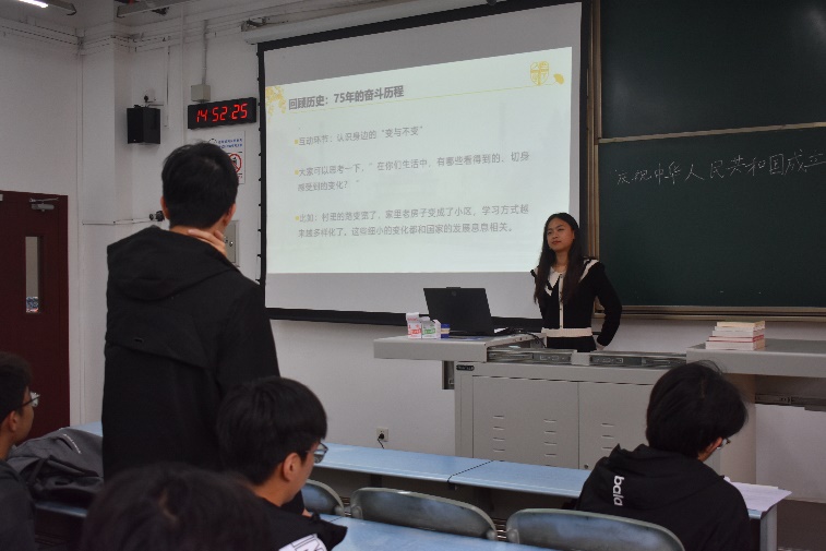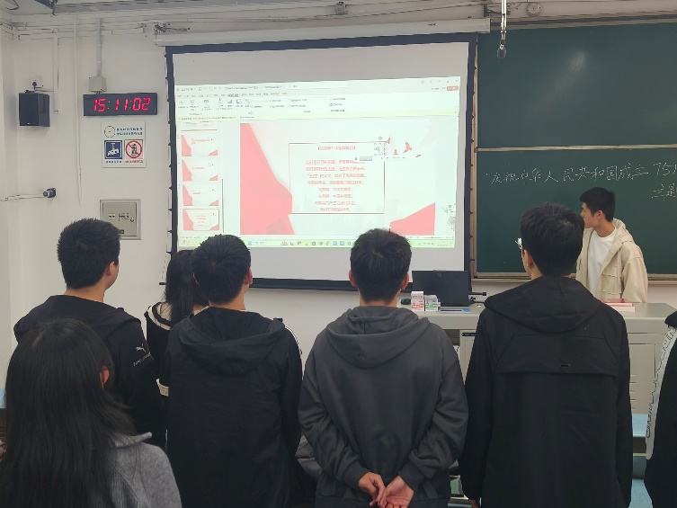 紧接着,曾丹老师带领大家从经济腾飞、社会进步、科技创新以及国际地位显著提升四个方面,全面回顾了中华人民共和国成立75周年来的奋斗历程。她指出,作为新时代的青年,应铭记使命,勇于担当,将个人的理想追求融入国家的发展大局之中,用青年的智慧和汗水为国家的发展添砖加瓦,贡献力量。