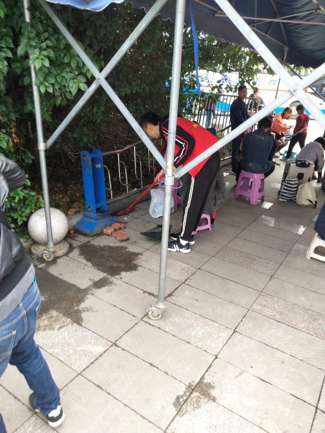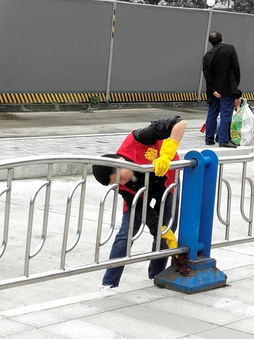 第一组打扫卫生的同学工作量最大,但大家都很认真。有些同学拿着扫帚在清扫候车大厅里的垃圾,尽管很累,但仍然坚持着打扫完了客运站里所有的垃圾:有些同学带着手套,拿着抹布,擦拭着候车大厅里的花盆,栏杆,使得原本灰扑扑的大厅变得光亮可鉴。整个客运站随处可见的戴着小红帽、正在打扫卫生的志愿者们形成了一道亮丽的风景线。