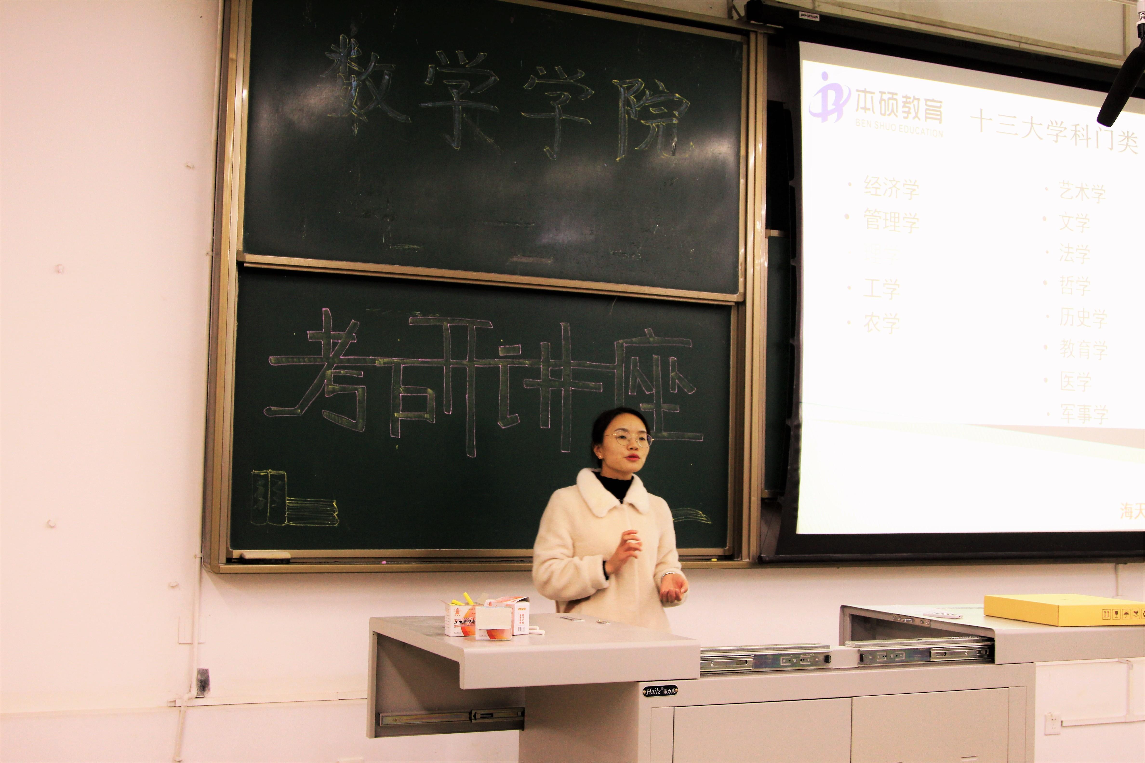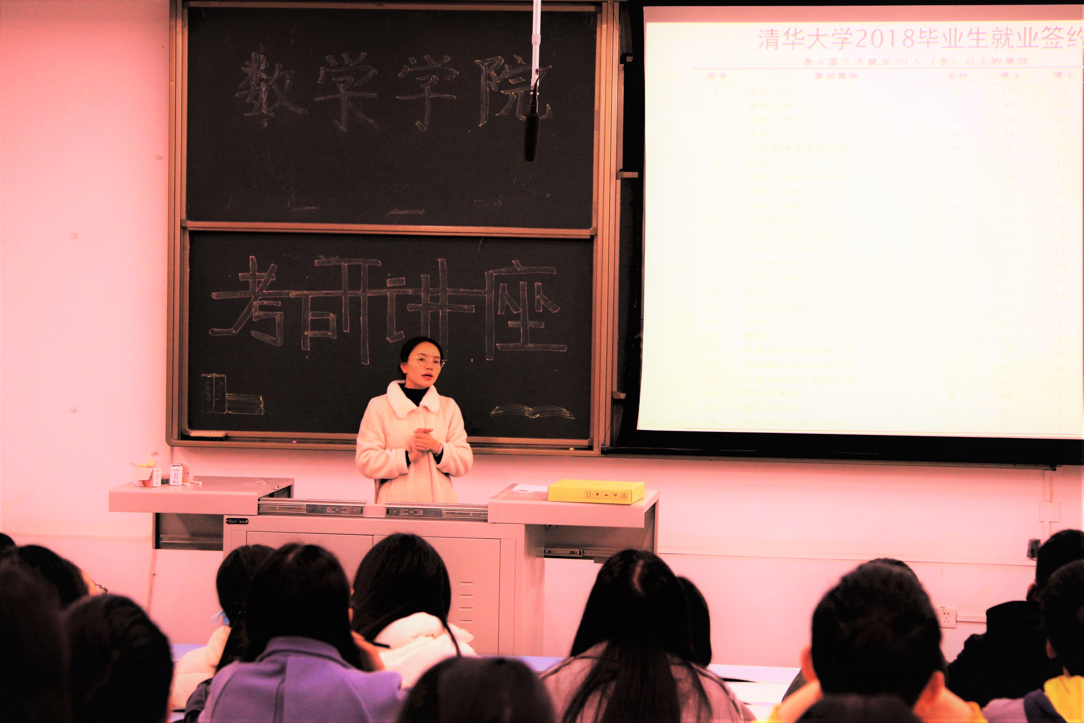 杜老师以中国大型企业在各高校的招聘情况、清华北大毕业生就业去向等问题开始了本次讲座。此次讲座主要分为以下三个方面:今年各大高校数学、统计招生复试线的分析,应用数学、应用统计学习辅导提高需要参加的相关考试,以及硕士研究生中学硕和专硕的区别。