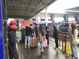 下午1时,青协的小伙伴在学校西门集合,一起前往茶店子客运站。半小时后,头戴小红帽,身着红马甲的小伙伴明确了分组分工,分布在人潮涌动的客运站的各个地方。