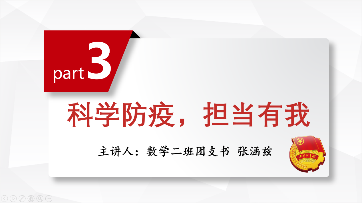 接着数学二班团支部书记张涵兹介绍了新型冠状病毒肺炎疫情的发展以及最新的情况。她谈到,此次疫情正值春节期间,形势紧迫。全国各族人民在党的坚强领导下,众志成城,支援武汉,疫情防控工作有效进行。而发展到3月12日,新型冠状病毒肺炎疫情在中国已经得到了明显的控制,治愈患者人数更是突破6万人。