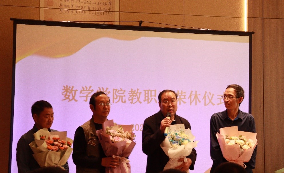 荣休教师徐扬教授讲话。徐扬教授回忆了学校数学学科建设发展历史。他表示,正是历届教师的不懈努力,才有了学院各专业的发展,才有了如今学院的进步与成就,希望老师们继往开来,开拓进取。同时他表示,由于学院秉持先进的教育理念,重视人才引育,解决了本校数学师资缺乏的问题,希望学院继续重视人才引育。最后,他对学院实验室平台提出期望,希望全院老师继续努力,对国家、学校和学院发展做出更多更大的贡献。