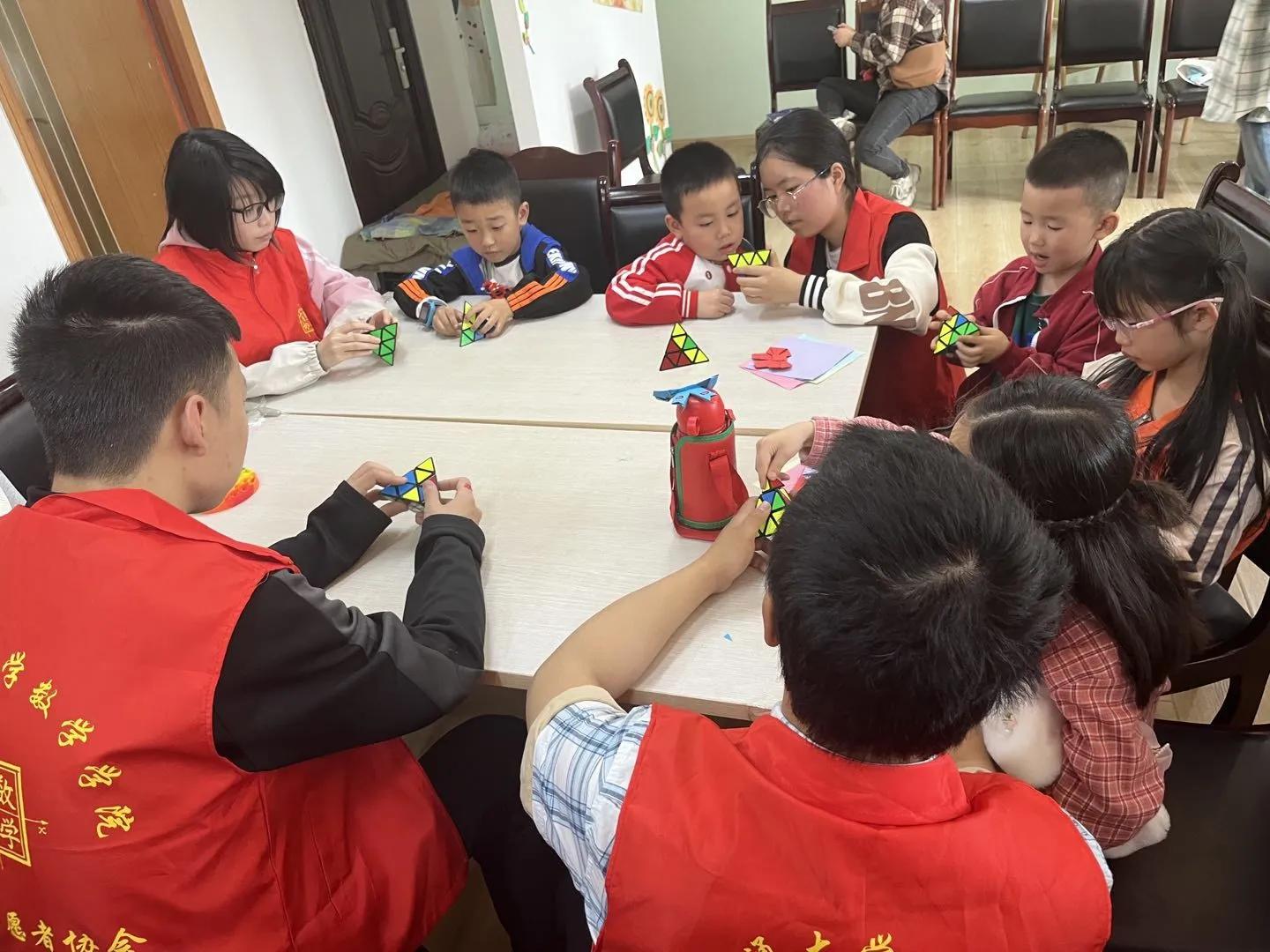 最后一期活动于5月13日进行,志愿者们组织进行了一场魔方复原比赛,小朋友们踊跃参加,积极展示自己在六期活动中学到的知识。比赛结束后小朋友们跟随志愿者学习了玫瑰花折纸,并将作品作为母亲节礼物送给了家长们,至次本次志愿活动落下帷幕。