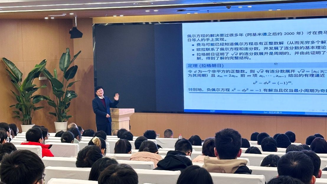 田野院士以图文并茂的方式从阿基米德的群牛问题出发,介绍由费马、欧拉、拉格朗日和高斯开启的与佩尔方程相关的精彩故事,以及和Sol流形的定向性问题的联系。田院士把晦涩难懂的拓扑问题讲解得通俗易懂,举重若轻背后积淀着融会贯通的丰富知识,深入浅出地展示了数学的无穷魅力、奥秘和神奇,揭示了数论、拓扑、代数几何等学科之间的深刻联系,引起在场师生的浓厚兴趣。报告最后,田院士与师生进行了广泛而热烈的交流。
