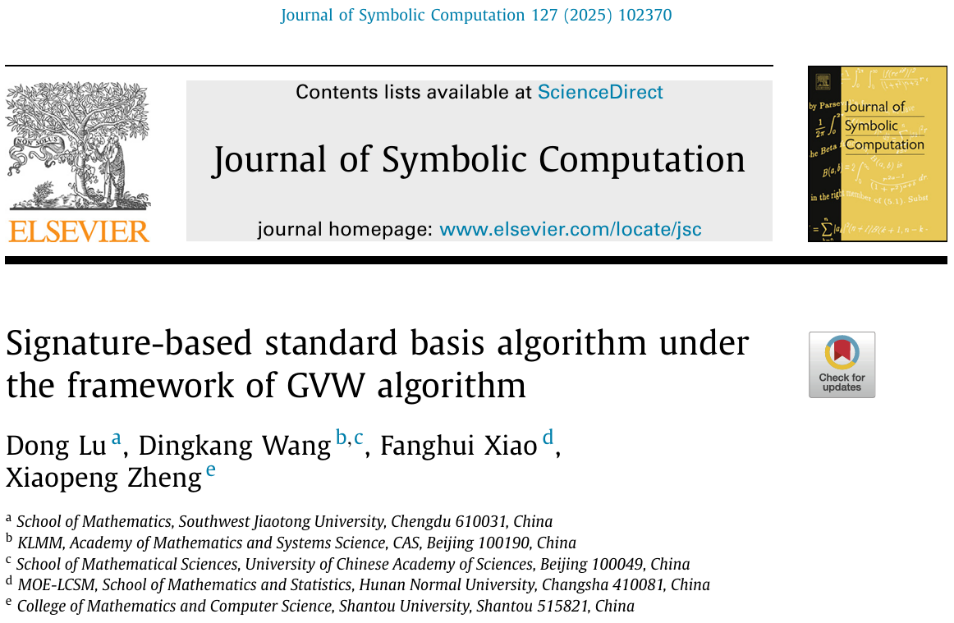 近期,我院鲁东副教授最新研究成果发表在符号计算领域权威期刊《Journal of Symbolic Computation》上。鲁东副教授为该论文第一作者,合作者包括中国科学院系统所的王定康研究员、湖南师范大学的肖方慧老师和汕头大学的郑晓鹏老师。《Journal of Symbolic Computation》是由欧洲科学院院士Bruno Buchberger教授于1985年创办的符号计算领域的权威期刊,我国著名数学家吴文俊院士曾担任该期刊的第一届编委。该杂志涉及的研究领域包括计算代数、计算几何(非线性)、符号计算语言和系统的设计与实现等。目前该期刊是中国数学会推荐的T2期刊。