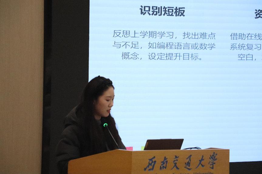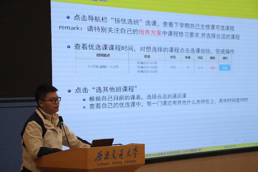 优秀学生代表赵彦通为2024级本科生详细介绍了教务选课流程。他清晰阐述了三次选课的目的以及选课机制,并通过实际操作为同学们提供了具体的选课指导,帮助每位同学都对选课过程有全面深入的了解。随后他从自身经验出发,分享了如何通过选课来实现时间的更好利用,同时强调了合理安排课程时间的重要性,帮助同学们更高效地利用时间,更充实地度过大学生活。