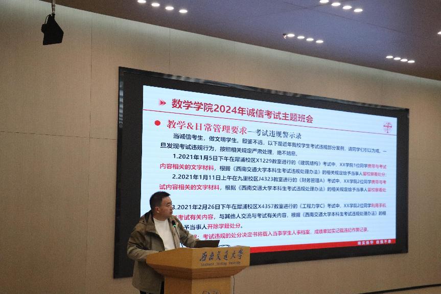 2024年诚信考试主题班会。他强调,考试不仅是对学生学习成果的一次测试,更是对个人品德和学术操守的一次考验。通过引用实际教学案例,黄书记详细阐述了学校关于考试纪律的各项规章制度,深刻地向同学们揭示了考试违规所带来的严重后果,起到了良好的警示作用。随后,吕薇老师进行阶段性学情分析及学习情况总结。通过详细的数据对比,清晰地展示出各专业、各班级在学习上的优势与不足,点明共性问题并给出了具体的改进措施。她鼓励同学们弥补不足、改进方法,争取在期末考试中取得满意的成绩。
