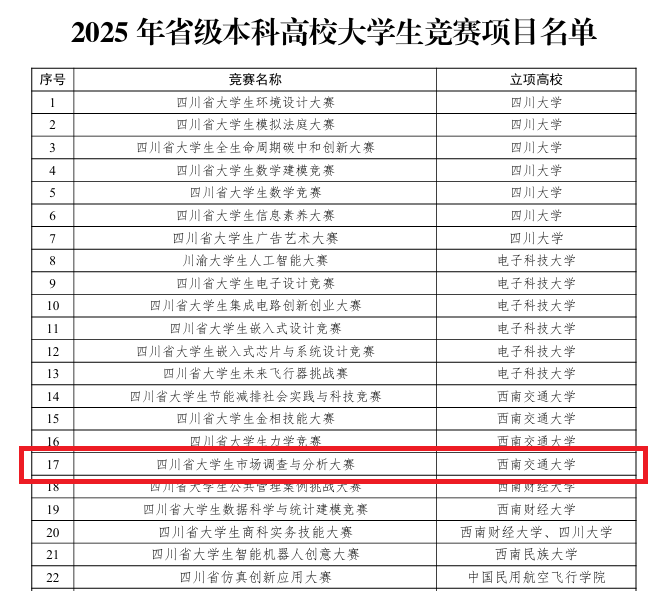 近日,四川省教育厅公布2025年省级本科高校大学生竞赛立项名单,由我院牵头申报的“四川省大学生市场调查与分析大赛”立项成功。