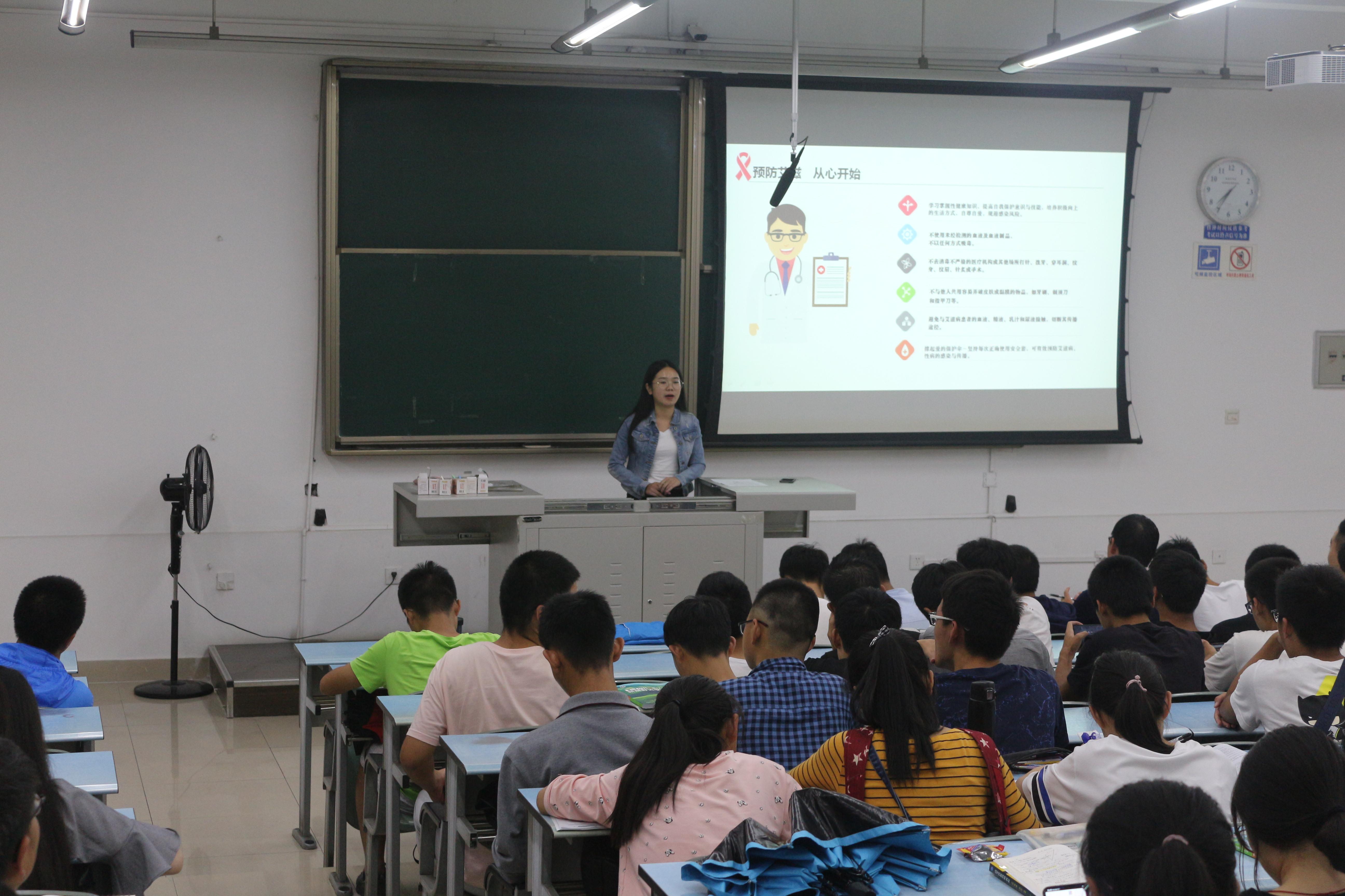 谢童心老师还为在座的18级新生普及了有关艾滋病防控的一些细节。谢老师从一些生活中的基本常识和现象讲起,通过与同学们的小互动让大家能更注重这个焦点问题。老师不仅介绍了一些艾滋病有关的病理知识,还为大家详细分析了艾滋病毒的传播途径,也针对这些途径一一分析了如何预防艾滋病,让大家对这个可怕的疾病有了基本的认识。