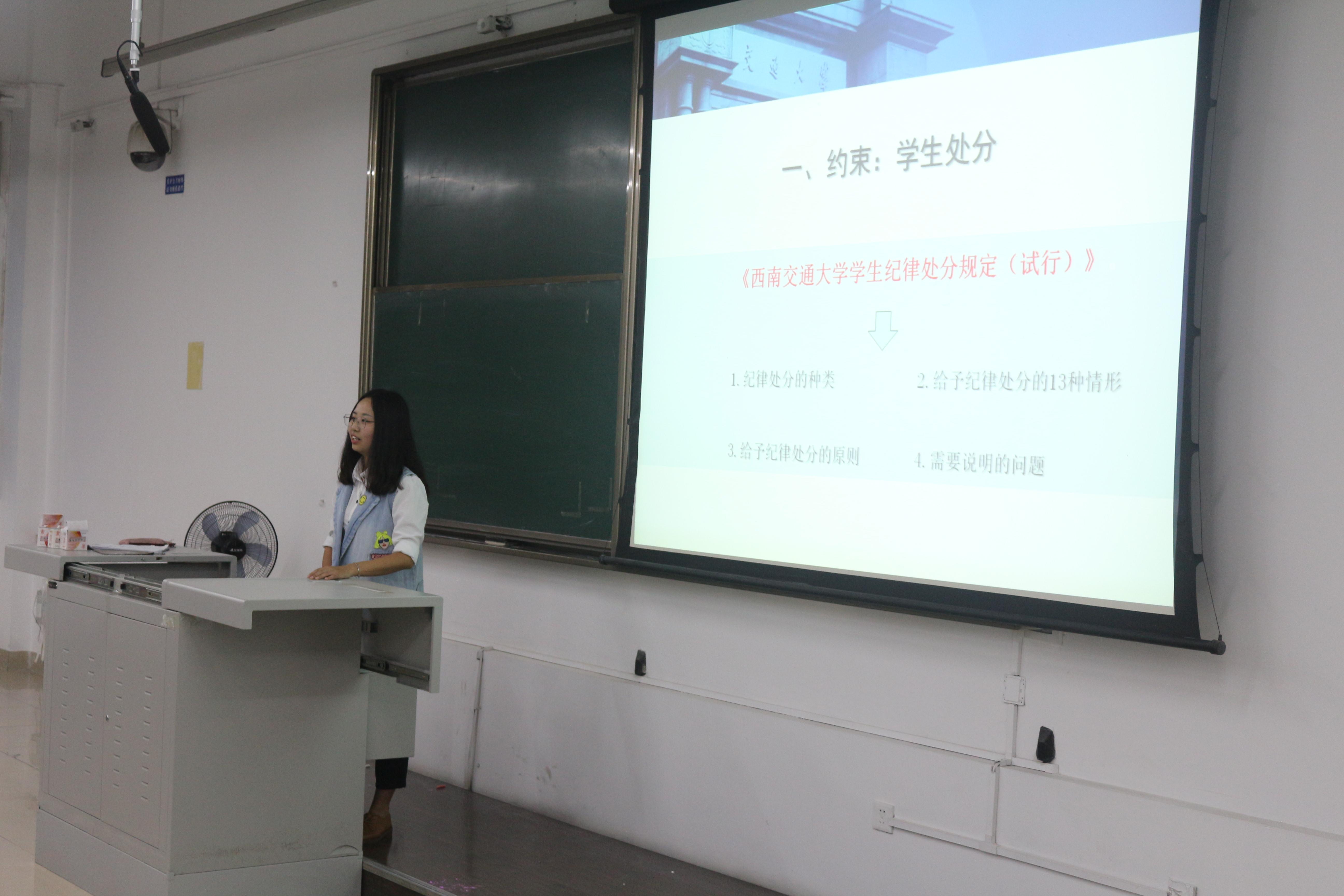 本科生管理规章制度汇编》的大体内容。钟老师首先介绍了规章制度的大体分类,帮助同学们更清晰地理解学校的管理制度。随后,钟老师从13种处分情况入手,为新生们讲解学校处分的规矩,并告诫大家守规矩、讲诚信。接着,老师讲解了一些关于荣誉称号的问题,旨在让大家正确认识奖学金与助学金,并鼓励大家努力去争取荣誉。