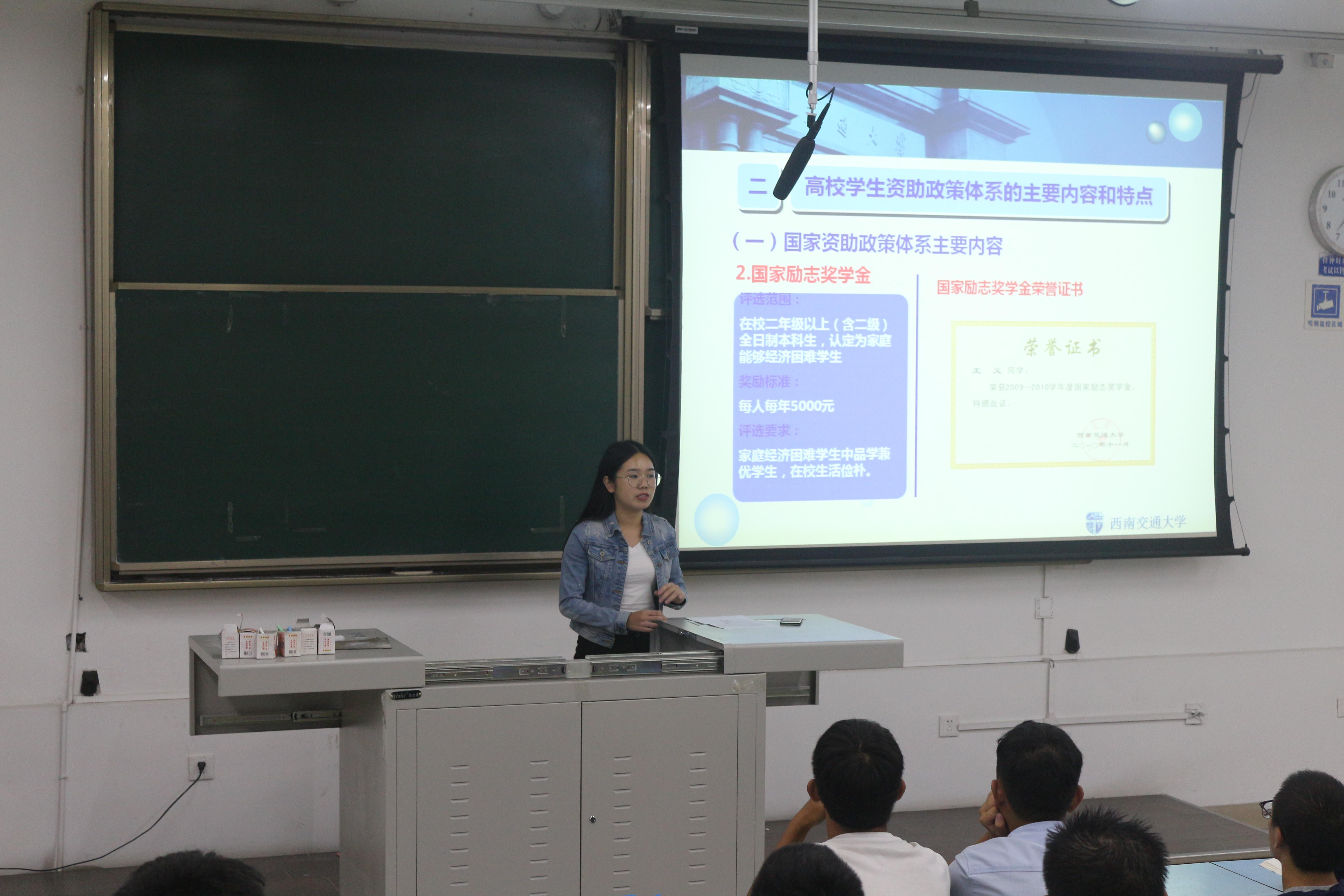 谢童心老师为同学们讲解了有关学生资助的细节。谢老师首先为大家介绍了申请救助的方法以及国家励志奖学金的申办条件与过程。随后谢老师又为大家详细地介绍了高校学生资助政策体系的主要内容和特点,让大家更加清楚地了解了学生资助的有关情况。